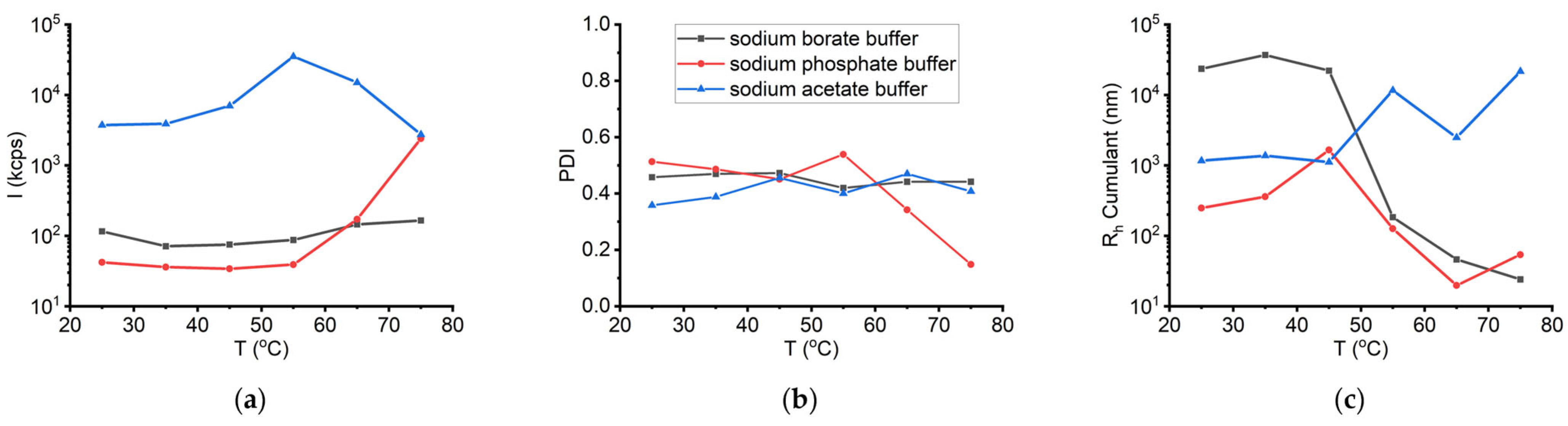 Figure 11 presents the sum of the obtained DLS results for the sLOX1 solutions in the three different investigated buffers. In contrast to the results obtained in sodium borate buffer, the presence of sLOX1 in sodium phosphate buffer appears to promote oligomerization/aggregation at both low (0.1 mg/mL) and high (1 mg/mL) enzyme concentrations. As observed, temperature increase leads to a notable increase in scattering intensity above 65 °C for the 0.1 mg/mL solution and above 55 °C for the 1 mg/mL solution.