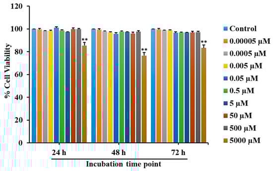Cell viability evaluation of L-quebrachitol on RAW 264.7 cells. Cells were treated with varying concentrations of L-quebrachitol for 24, 48, and 72 h, and cell viability was detected with an MTT assay. Each data point represents the mean of 3 independent experiments on 4 identical samples ± SEM. ** p < 0.01 versus the control group.
