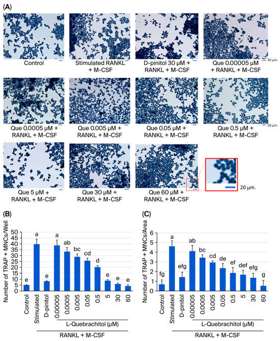 Effect of L-quebrachitol on multinucleated osteoclast formation, induced with RANKL. (A) RAW 264.7 cells were incubated with L-quebrachitol (0.05 nM–60 µM) under the stimulation of RANKL and M-CSF, and the number of differentiated cells, multinucleated osteoclasts, was observed using TRAP staining. Cells that consisted of at least three nuclei were specified as TRAP-positive and reported as (B) cells/well (96-well plate) and (C) cells/area. Each data point represents the mean from 3 independent experiments on 4 identical samples ± SEM. Letters on each column indicate statistically significant differences at p < 0.05.