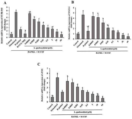 Effect of L-quebrachitol on the RANKL-induced NF-κB signaling pathway. RAW 264.7 cells were treated with various doses of L-quebrachitol and 2.5 µM BAY11-7082 in the presence of RANKL 20 ng/mL and M-CSF 20 ng/mL for 3 days. (A) Relative mRNA levels of NF-κB-P65, (B) NFATc1, and (C) c-Fos were evaluated using quantitative RT-PCR analysis. The data was obtained from 3 independent experiments on 4 replicates and presented as mean ± SEM. Letters on each column represent statistically significant differences at p < 0.05.