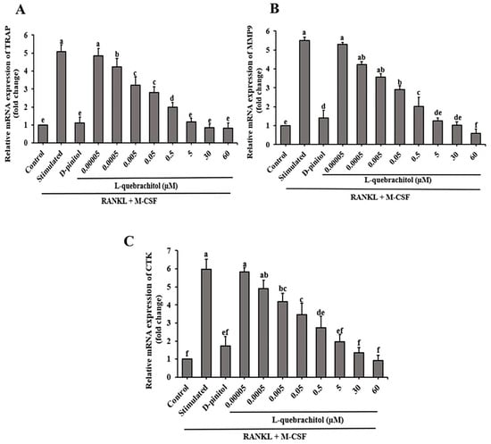 L-Quebrachitol downregulates the expression of osteoclastogenic genes. RAW 264.7 cells were treated with different doses of L-quebrachitol in the presence of RANKL (20 ng/mL) and M-CSF (20 ng/mL) for three days. (A) Relative mRNA levels of TRAP, (B) MMP-9, and (C) cathepsin K were evaluated using RT-PCR analysis. The data was obtained from 3 independent experiments on 4 replicates and presented as mean ± SEM. Letters on each column represent statistically significant differences at p < 0.05.
