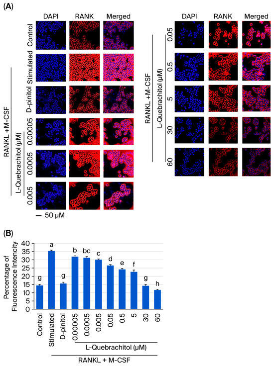 L-Quebrachitol remarkably downregulates the expression of RANK. RAW 264.7 cells were treated with different doses of L-quebrachitol in the presence of RANKL (20 ng/mL) and M-CSF (20 ng/mL) for 24 h. (A) Expression of RANK was measured via immunofluorescence staining; the fluorescence image was captured with a fluorescence microscope at a magnification of 20× and (B) analyzed using Image J software. The data was obtained from 3 independent experiments in 4 replicates and presented as mean ± SEM. Letters on each column represent statistically significant differences at p < 0.05.