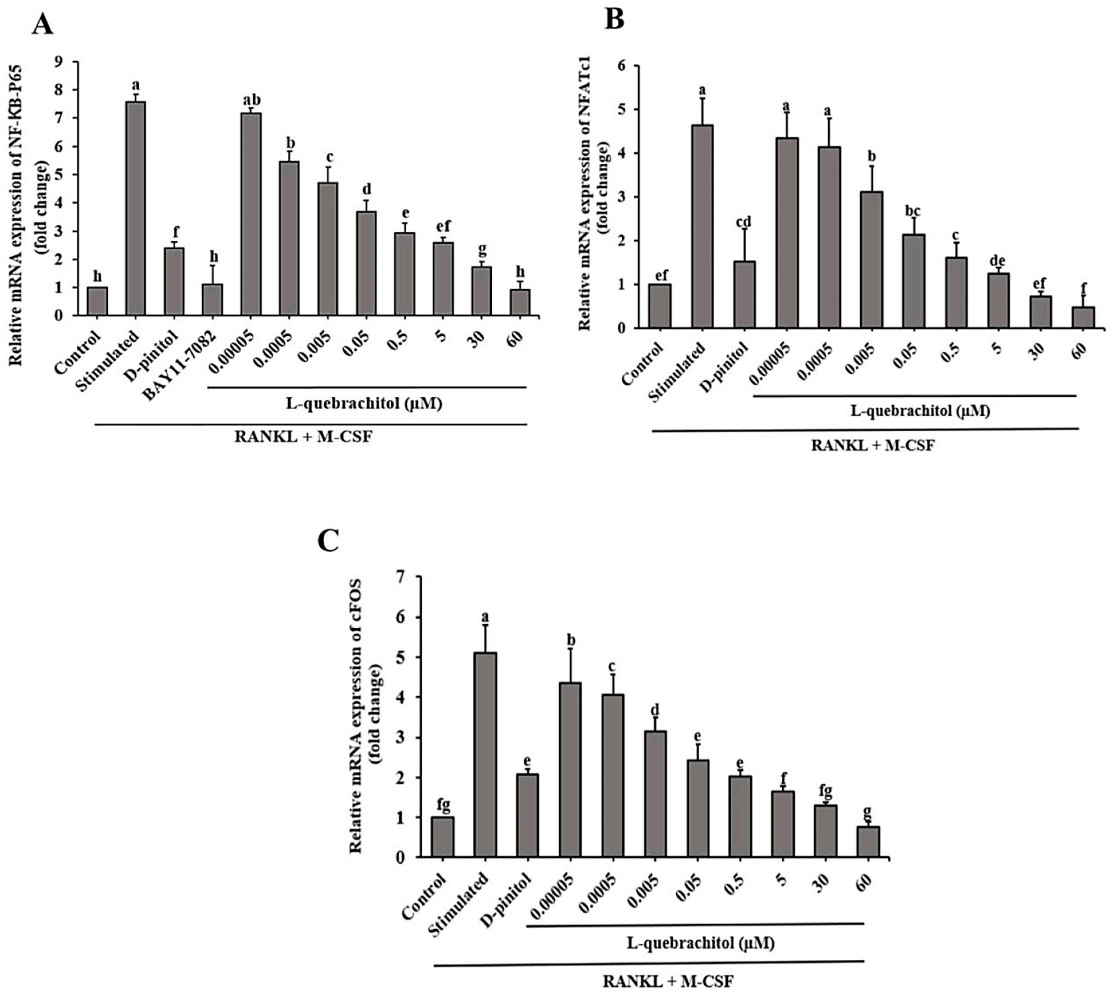 3.5. L-Quebrachitol Downregulates mRNA Expression of NF-κB-P65, NFATc1, and C-Fos