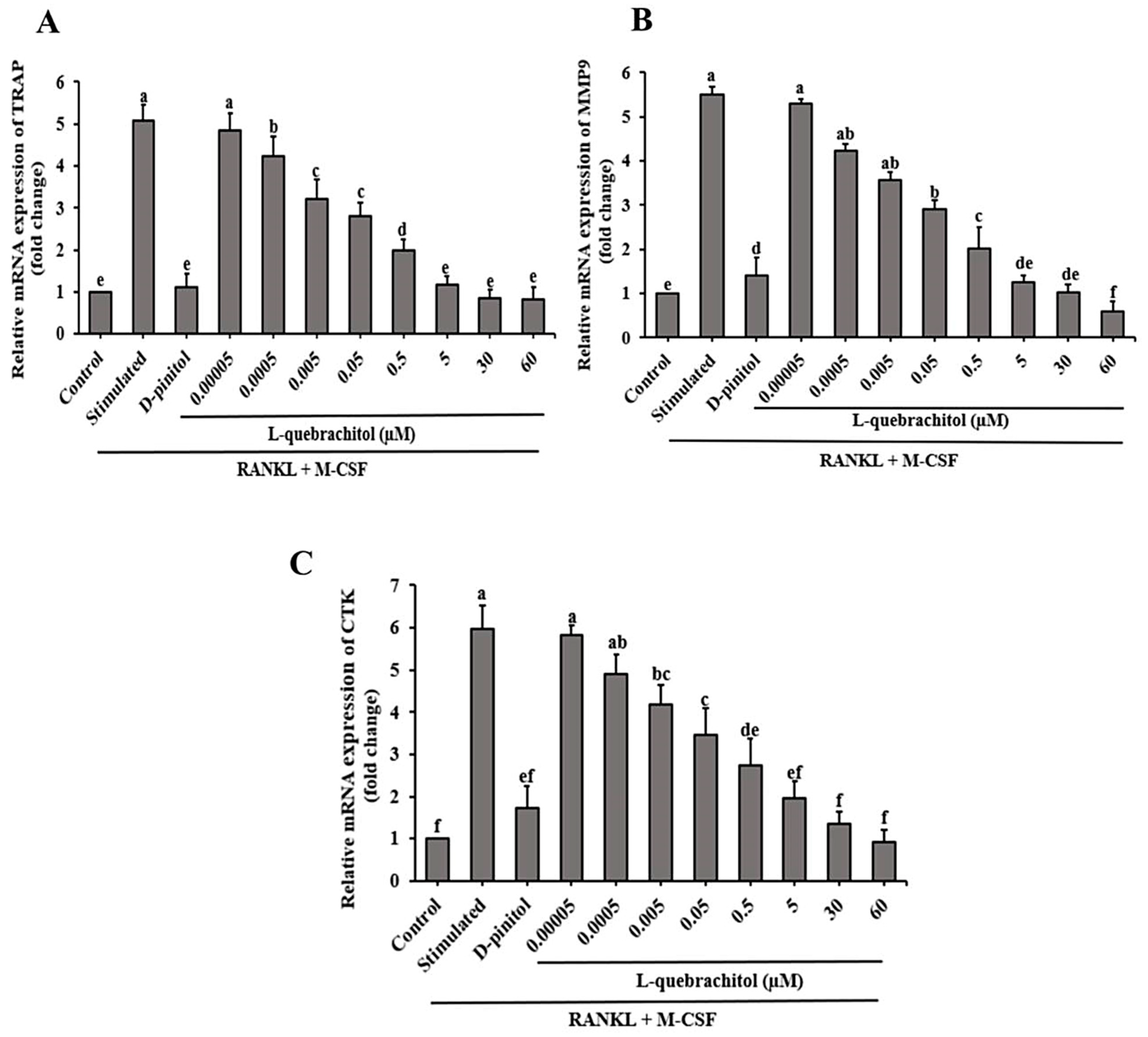 3.6. Effect of L-Quebrachitol on Osteoclastogenic Genes