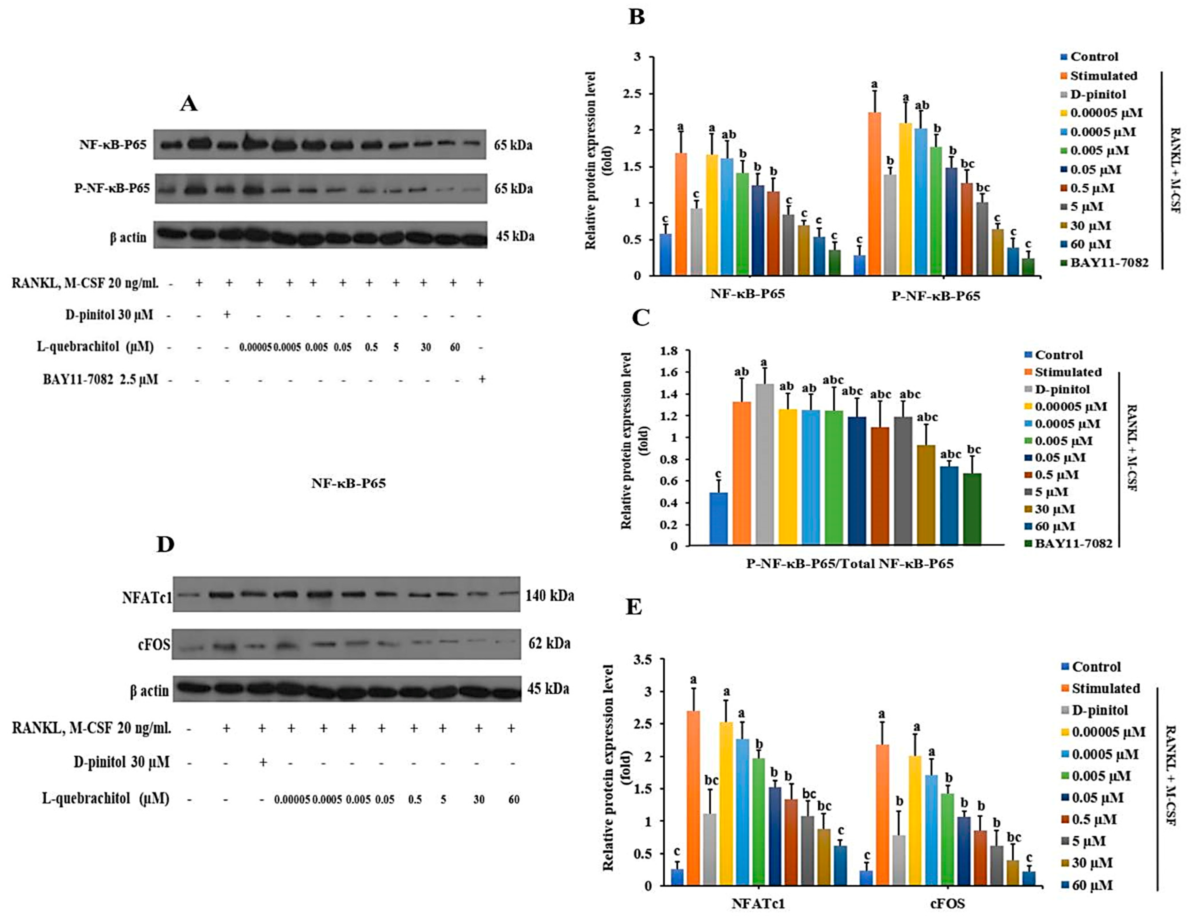 3.7. Effect of L-Quebrachitol on Protein Expression Level of NF-κB-P65, NFACTc1, and C-Fos