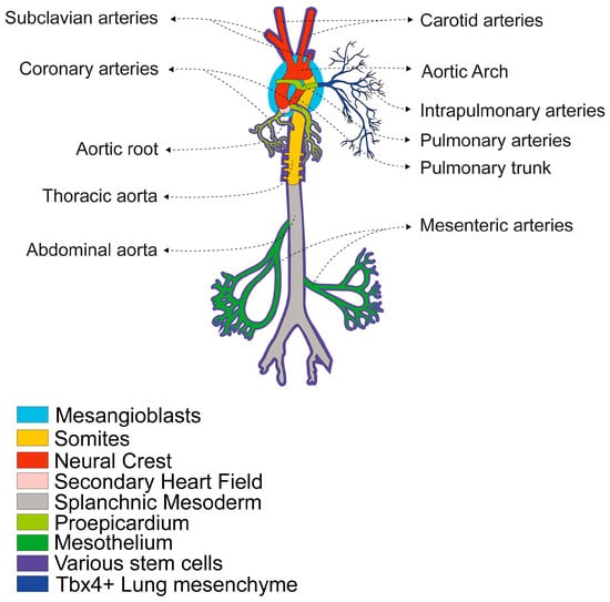 Developmental Origins of VSMCs in the Main Arteries. The diagram illustrates the different embryonic origins of VSMCs in different arteries, with a colour-coded key: Mesangioblasts (blue) give rise to intrapulmonary artery walls. Somites (orange) give rise to the descending aorta. The Neural Crest (red) contributes VSMCs to the major arteries near the heart, including the ascending aorta, the aortic arch, the pulmonary trunk, the ductus arteriosus, the aorticopulmonary septum, the innominate artery, the right subclavian arteries, the common carotid arteries and the arteries of the head and neck [25,31]. The Secondary Heart Field (pink) contributes VSMCs to the proximal great arteries, including the aortic root, the arterial pole at the base of the heart and the pulmonary trunk [31,32]. The Splanchnic Mesoderm (grey) gives rise to SMCs in the gastrointestinal and respiratory systems, as well as the systemic trunk and limb arteries, which contain most of the body’s musculature [14]. The Proepicardium (light green) is the source of progenitors for the coronary vessels [25,31]. The Mesothelium (dark green) gives rise to VSMCs within the mesenteric vasculature and its branches that penetrate the gut, as well as within pulmonary arteries [25,33]. Tbx4+ Lung mesenchyme (dark blue) gives rise to intrapulmonary artery walls [34] and various stem cells (violet) residing in the adult artery wall can differentiate into VSMCs or pericytes in response to growth factors or vascular injury [25,27].