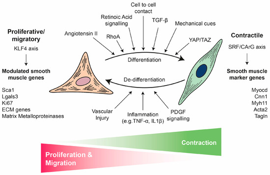VSMC phenotypic switch: from contractile to proliferative/migratory phenotype. VSMCs exhibit remarkable phenotypic plasticity, switching between a differentiated, quiescent, contractile state (right) and a dedifferentiated, proliferative/migratory state (left). This switch is critical for vascular health and disease. The contractile VSMC phenotype (differentiated) is characterised by contraction and a low rate of proliferation and migration. This phenotype is maintained and induced by various cues including cell-to-cell contact, retinoic acid signalling, TGFβ, angiotensin II, RhoA, YAP/TAZ and mechanical cues. The expression of key smooth muscle markers (e.g., Myocd, Cnn1, Myh11, Acta2 and Tagln) is controlled by the SRF/CArG axis. Following stimuli such as vascular injury, inflammation (e.g., TNFα, IL1β), or PDGF signalling, VSMCs undergo a phenotypic switch to a proliferative/migratory VSMC phenotype (dedifferentiated). This is characterised by enhanced proliferation and migration as well as the expression of modulated genes (e.g., Sca1, Lgals3, Ki67, ECM genes and matrix metalloproteinases) which are mainly controlled by the KLF4 axis. This switch is essential for repair, but it also contributes to CVD.