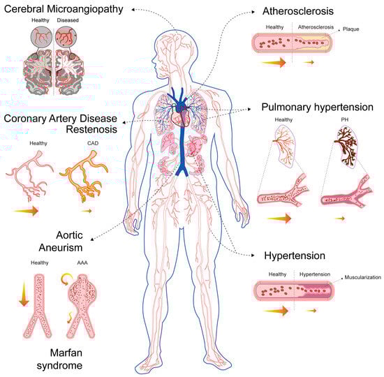 Based on their specific roles in disease pathophysiology, VSMCs are involved in disorders characterised by three primary processes: excessive proliferation or intimal hyperplasia (e.g., atherosclerosis, restenosis, graft failure and pulmonary hypertension (PH)) [66], degeneration and/or apoptosis (e.g., abdominal aortic aneurysm (AAA) and Marfan syndrome) [67,68] or altered contractility (e.g., hypertension and cerebral microangiopathy) [69,70] (Figure 3).