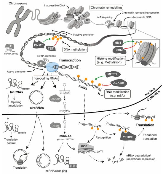 For a gene to be transcribed, the DNA must be in a relaxed, or ‘open’, configuration that allows access for transcription factors and the transcriptional machinery [181]. This accessible state is typically found at the promoters and enhancers of actively expressed genes [181]. Epigenetic processes modulate the structural and functional state of chromatin, converting it from a compact, transcriptionally repressive state (heterochromatin) to a relaxed, transcriptionally permissive state (euchromatin) and vice versa, thereby regulating gene expression. For our purposes, therefore, we use the term ‘epigenetics’ to refer to the mechanisms that regulate gene expression independently of changes in the DNA sequence [181]. Figure 4 depicts the core epigenetic mechanisms, which include DNA methylation, post-translational histone protein modifications, chromatin remodelling and non-coding RNAs [181]. Although distinct from classical epigenetics, epitranscriptomics is increasingly recognised as part of the broader epigenetic regulatory landscape [182]. Epitranscriptomics refers to the study of biochemical modifications to RNA molecules that regulate their function [183]. However, there is ongoing discussion as to whether epitranscriptomics should be considered part of epigenetics, since epitranscriptomic marks affect expression, but they are not necessarily inherited during mitosis or meiosis [182,184].