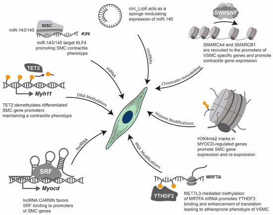 The alteration in cell fate during the pathological phenotypic switch of VSMCs is the direct result of underlying epigenetic mechanisms, which translate external, pathological cues into stable, heritable changes in gene expression [45,174]. These processes actively modulate gene expression, thereby reprograming the VSMC transcriptome and locking the cell into its new phenotype [175]. In the following sections, we will explore the various known epigenetic mechanisms that govern VSMC gene expression and its alterations in pathological contexts.