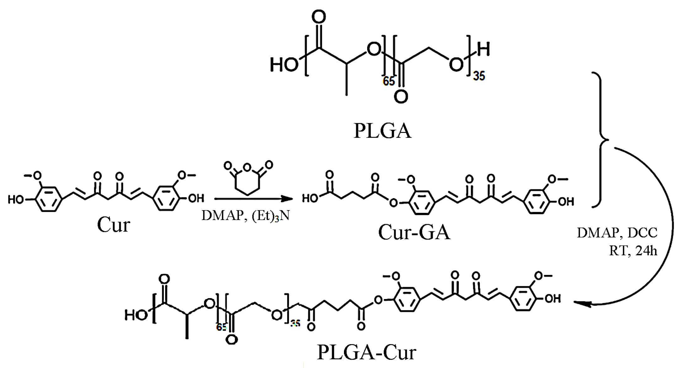2.2. Synthesis of the New PLGA-Cur Carrier