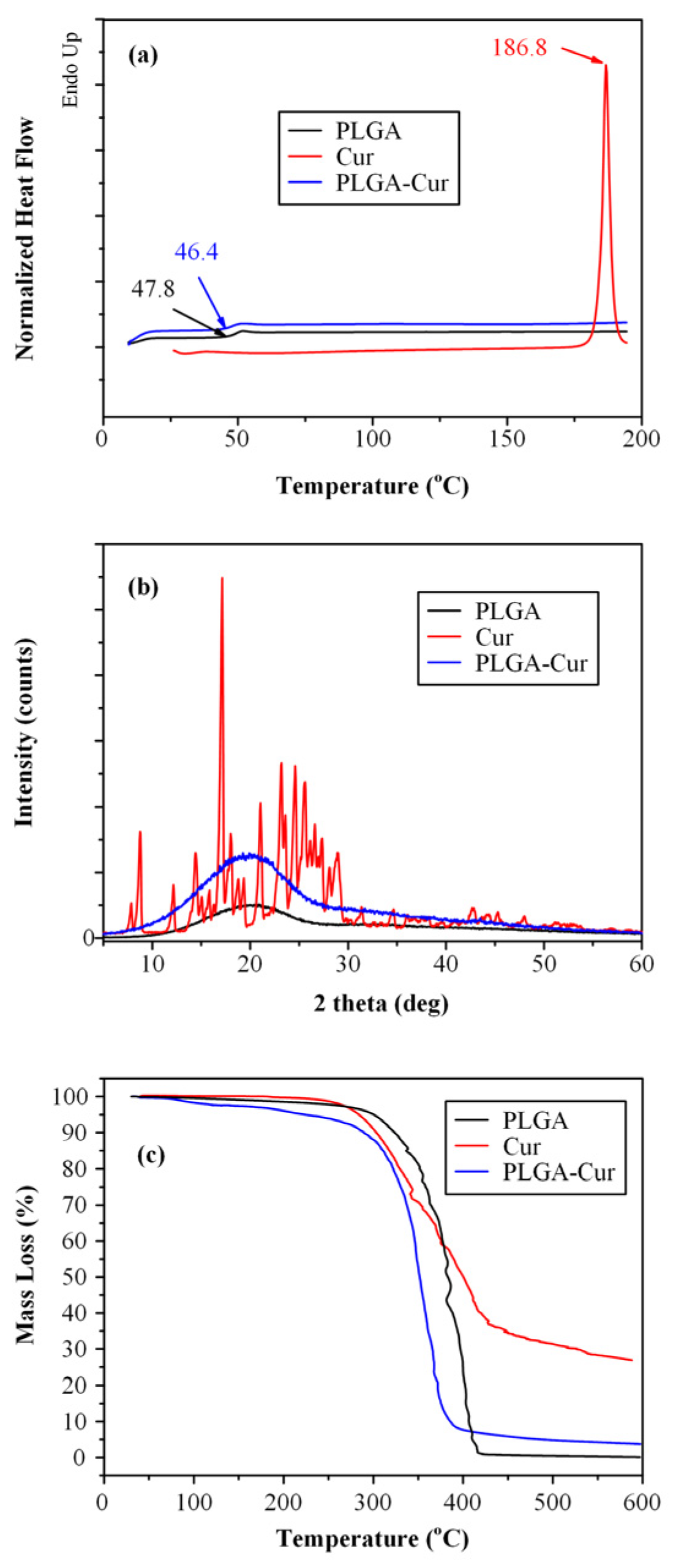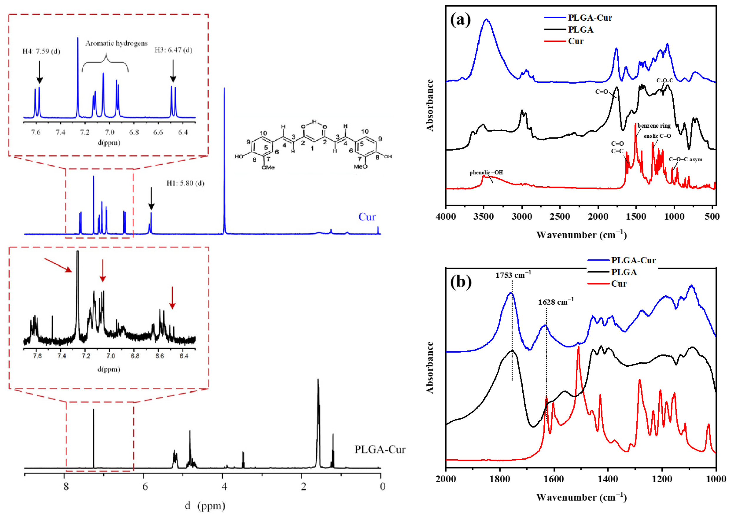 3.1. Synthesis and Characterization of the New PLGA-Cur Carrier