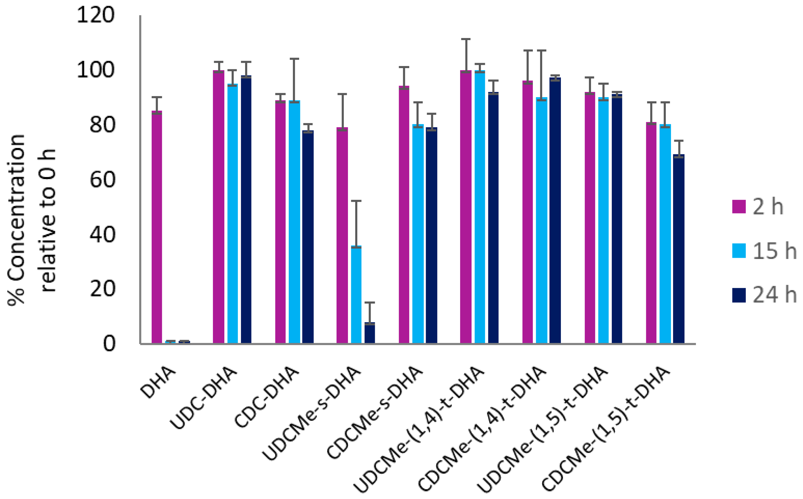 | UDCMe-(1,4)-t-DHA | 0.692 ± 0.141 | 15 | 1.478 ± 0.268 | 4 |