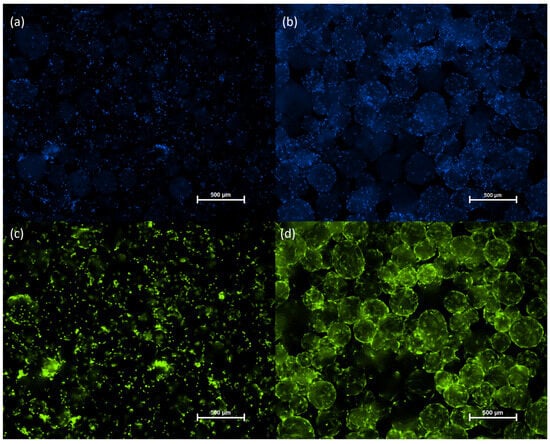 Cell adhesion and proliferation on the microcarriers were monitored via fluorescence microscopy using dual staining with Calcein AM and Hoechst 33342. Calcein AM selectively labeled viable cells with green fluorescence, while Hoechst 33342 stained all cell nuclei with blue fluorescence. Fluorescence imaging confirmed successful attachment of cASC to the microcarrier surface as early as 4 h after seeding (Figure 2a,c). After 6 days of cultivation, a substantial increase in cell density was observed (Figure 2b,d), indicative of active cASC proliferation on the microcarriers under the applied culture conditions.