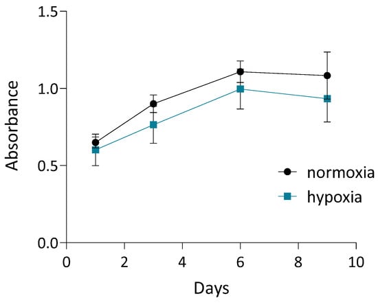 Quantification of cASC proliferation using MTT assay on days 1, 3, 6, and 9 of 3D dynamic culture under normoxic and hypoxic conditions. Values represent mean ± SD. Complete medium exchange was performed on days 3, 6, and 8.