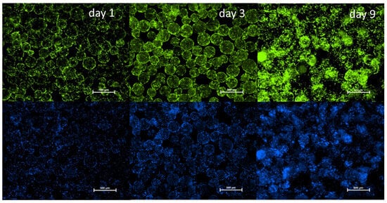 To complement these findings, fluorescence microscopy was used to visualize cell attachment and distribution on days 1, 3, and 9. Viable cells were stained with Calcein-AM (green), and nuclei were labeled with Hoechst 33342 (blue). As shown in Figure 4, cASC adhered to the microcarriers and began spreading by day 1. By day 3, an increase in cell density and spreading was evident. On day 9, the microcarrier surfaces were covered by a mostly continuous, although not fully uniform, single-cell layer of cASCs, indicating successful colonization and progressive growth. Therefore, Cultispher S-based 3D dynamic culture system effectively supports the proliferation and viability of cASC over time.