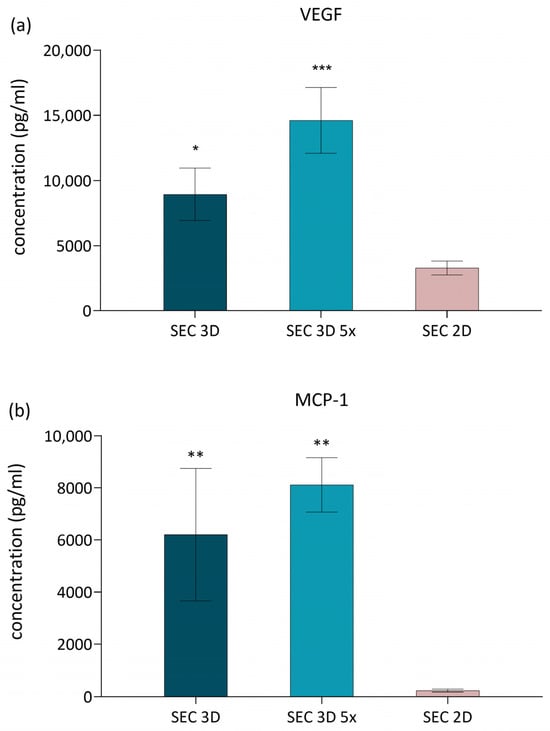 VEGF and MCP-1 were selected as representative factors because they are well-established markers of MSC pro-regenerative and angiogenic activity, widely reported in the literature [27,28,29]. To evaluate the effect of 3D dynamic culture on the secretion of pro-regenerative factors, MCP-1 and VEGF levels were quantified in SEC 2D and SEC 3D samples. VEGF concentrations were significantly elevated in both the SEC 3D and SEC 3D 5× compared to the 2D condition (Figure 6a). MCP-1 levels were also increased in SEC 3D and SEC 3D 5× relative to SEC 2D (Figure 6b). However, statistical significance was observed only in the concentrated 3D condition (SEC 3D 5×; p < 0.05), while the non-concentrated SEC 3D displayed a similar trend without reaching significance.