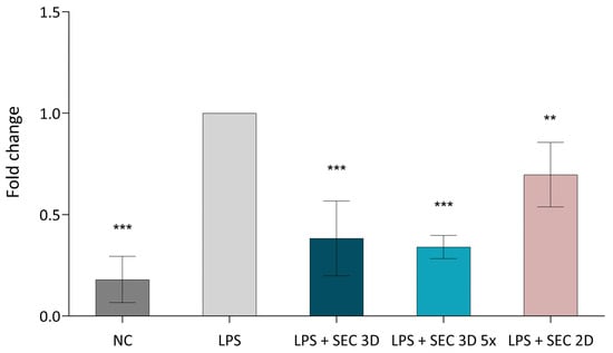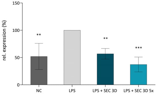 Effect of SEC 3D on TNFα expression in activated M1 macrophages. The U937 macrophages were activated using LPS at a concentration of 100 ng/mL. The experimental groups included a negative control (NC, non-activated macrophages without LPS), a positive control (LPS, macrophages + LPS), and macrophages treated with LPS in combination with SEC 3D (LPS + SEC 3D) and concentrated SEC 3D 5× (LPS + SEC 3D 5×). Data represent the means ± SD from at least four independent experiments and are shown relative to the positive control (LPS). Statistical significance was assessed using one-way ANOVA followed by Dunnett’s post hoc test: ** p < 0.01, *** p < 0.001.