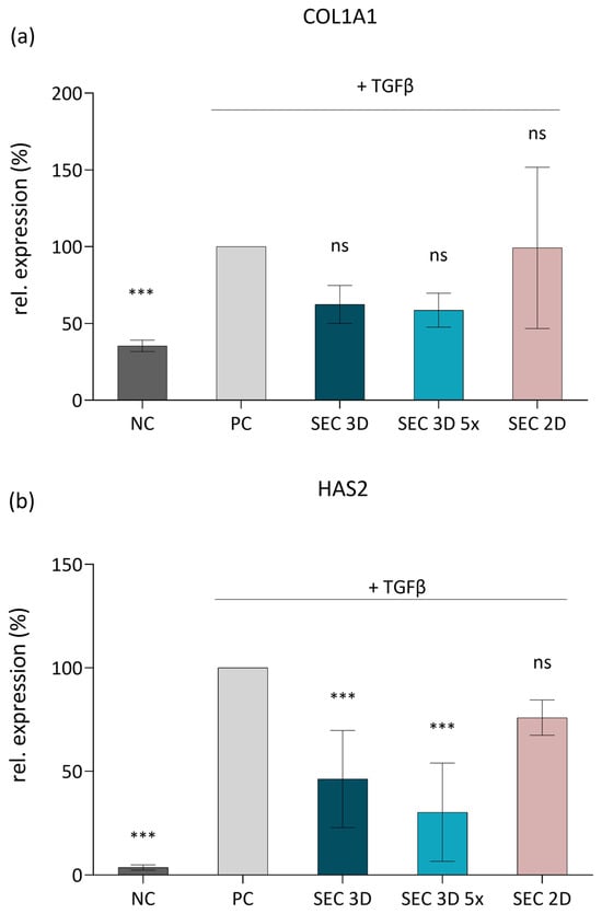 Effect of cASC secretome on ECM-related gene expression in TGF-β1-stimulated 3T3 fibroblasts. Expression levels of COL1A1 (a) and HAS2 (b) were determined by RT-qPCR after 48 h of stimulation with TGF-β1 and subsequent treatment with SEC 3D, concentrated SEC 3D 5×, or SEC 2D. Data are presented relative to the positive control (PC; 3T3 fibroblasts activated with TGF-β1). Bars represent mean values from at least free independent experiments ± SD. Statistical significance was calculated in comparison to PC; *** p ≤ 0.001, ns = not significant; one-way ANOVA followed by Dunnett’s post hoc test.