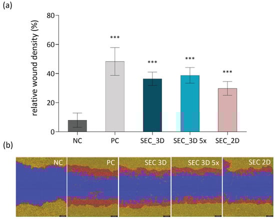 Effect of cASC SEC treatment on NIH 3T3 fibroblast migration. (a) Quantification of 3T3 cell density in the wound area after treatment with control (NC, growth medium without FBS), SEC 3D and concentrated SEC 3D 5×. All test conditions were performed in serum-free medium (0% FBS). The positive control (PC) consisted of growth medium supplemented with 10% FBS to stimulate cell migration. Each sample was performed in triplicate in three independent assays. Statistical analysis was performed using one-way ANOVA followed by Dunnett’s post hoc test. Results are presented as mean ± SD. Statistical significance was calculated for each sample in comparison to NC; *** p ≤ 0.001. (b) Representative images from the scratch assay showing NIH 3T3 fibroblast migration 24 h post-wounding. Masks were applied using the Incucyte system to highlight the wound area (blue), initial scratch wound area (red) and migrating cells (yellow).