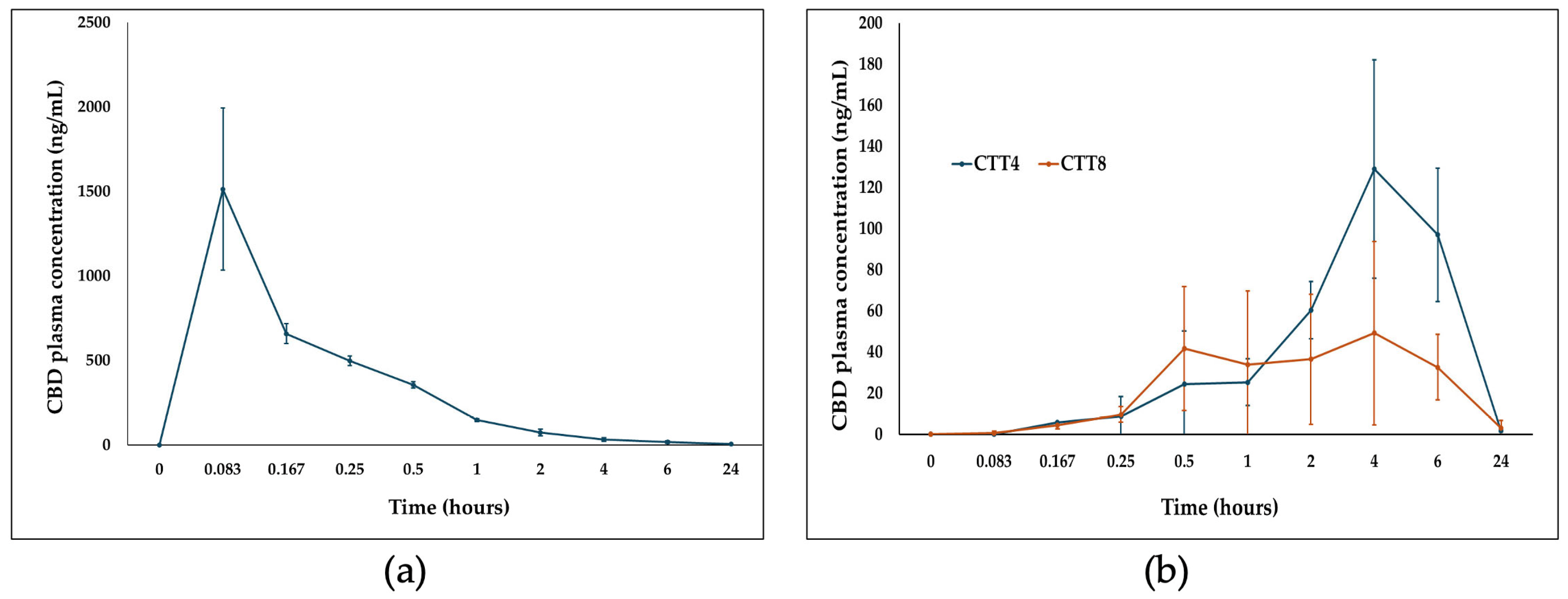 - Kolli, A.R.; Hoeng, J. Cannabidiol bioavailability is nonmonotonic with a long terminal elimination half-life: A pharmacokinetic modeling-based analysis. Cannabis Cannabinoid Res. 2025, 10, 81–91. [Google Scholar] [CrossRef]