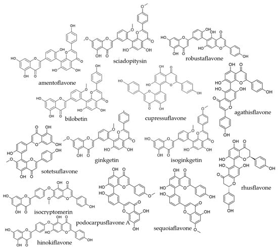 - Šamec, D.; Karalija, E.; Dahija, S.; Hassan, S.T.S. Biflavonoids: Important Contributions to the Health Benefits of Ginkgo (Ginkgo biloba L.). Plants 2022, 11, 1381. [Google Scholar] [CrossRef]