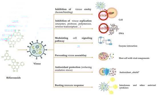 Schematic overview of the principal antiviral mechanisms attributed to biflavonoids. Biflavonoids may inhibit viral entry by blocking interactions between viral surface proteins and host cell receptors, interfere with viral replication through inhibition of viral enzymes such as polymerases and proteases, suppress viral assembly and release, and modulate host immune responses. Antioxidant and anti-inflammatory effects may further contribute to limiting viral propagation and host cell damage.