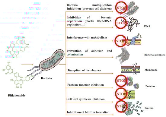 Biflavonoids play a role in responding to microbial infections [41]. Considering the literature, studies suggested that biflavonoids have considerable antibacterial activity, which could assist in delaying the progression of various pathogens. While the specific antibacterial mechanisms of biflavonoids are yet to be fully elucidated, it is currently hypothesized that they rely on the known actions of their monomeric flavonoid counterparts [59]. Summarized information is presented in Table 3 and Figure 4.
