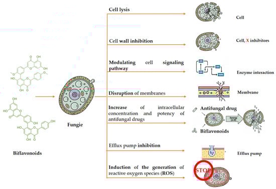 Schematic overview of the main antifungal mechanisms associated with biflavonoids. These include disruption of fungal cell membrane integrity, inhibition of cell wall biosynthesis, induction of oxidative stress through reactive oxygen species (ROS) generation, interference with intracellular signaling pathways, and inhibition of efflux pumps. Collectively, these effects can impair fungal growth, morphology, and viability.