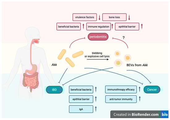 Figure 4. Schematic overview of the regulatory roles of Akkermansia muciniphila (Akk) and its bacterial extracellular vesicles (BEVs) in oral–gut crosstalk-related diseases. Akk and its BEVs promote the growth of beneficial microbial species while reducing the expression of virulence factors from oral pathogens. They enhance epithelial barrier integrity and contribute to immune homeostasis under inflammatory conditions. In cancer, they improve the efficacy of immunotherapy and stimulate anti-tumor immunity. Areas requiring further investigation are indicated with question marks (“?”). Created in BioRender. https://BioRender.com/gxdsdcw (accessed on 19 October 2025).