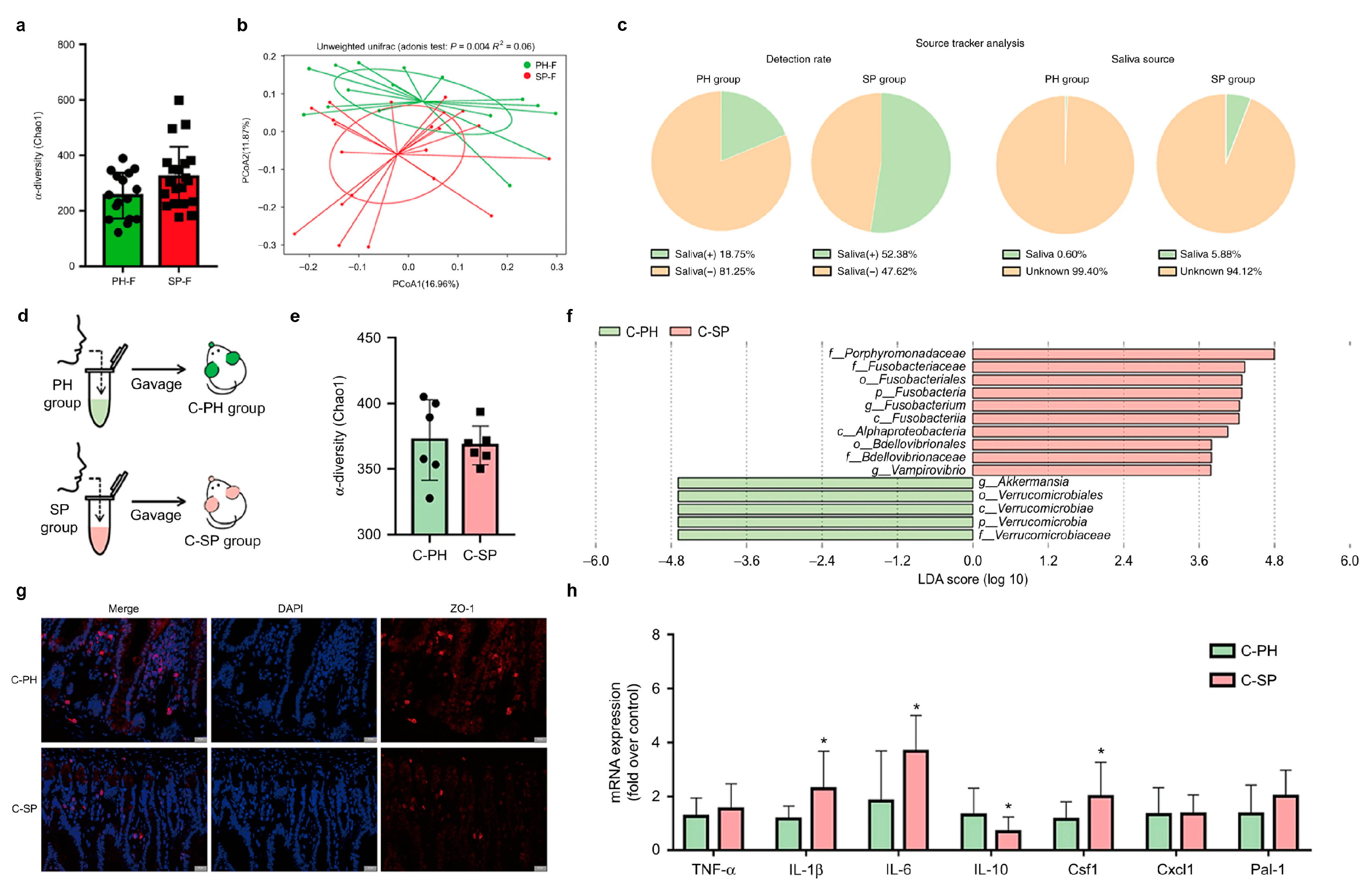 Figure 2. Oral-derived microbiota translocate to the gut under periodontitis, reshaping the gut microbiome, and altering intestinal barrier and inflammation. (ac) Human data. (a) α diversity-Chao1 of the salivary microbiota in periodontitis patients (PH) versus healthy controls (SP). Data were expressed as the mean  ±  SD. Statistical significance was determined through the Wilcoxon test. (b) Principal coordinates analysis (PCoA) shows separate clustering. (c) The Source Tracker analysis shows saliva-derived microbiota in the fecal samples. (df) Mouse experiment. (d) Schematic: mice were gavaged with saliva from PH or SP donors to generate C-PH and C-SP groups. (e) α diversity-Chao1 of the fecal microbiota. Data were expressed as the mean  ±  SD. Statistical significance was determined using the Wilcoxon test. (f) The LDA graph shows the taxonomic differences in the C-PH and C-SP groups. (g,h) Effects on the intestinal barrier and inflammation. (g) Representative images of immunofluorescence-stained sections of proximal colon tissue targeting ZO-1 (red) and DAPI (blue). Scale bar, 20 µm. (h) Relative mRNA expression of intestinal inflammatory markers. Statistical significance was determined using the t-test. (* p < 0.05) The phylum names in this figure are presented as originally published. In this review, the modern nomenclature is used, where Fusobacteria is now referred to as Fusobacteriota [48]. Adapted from Bao et al. [44], licensed under CC BY 4.0.