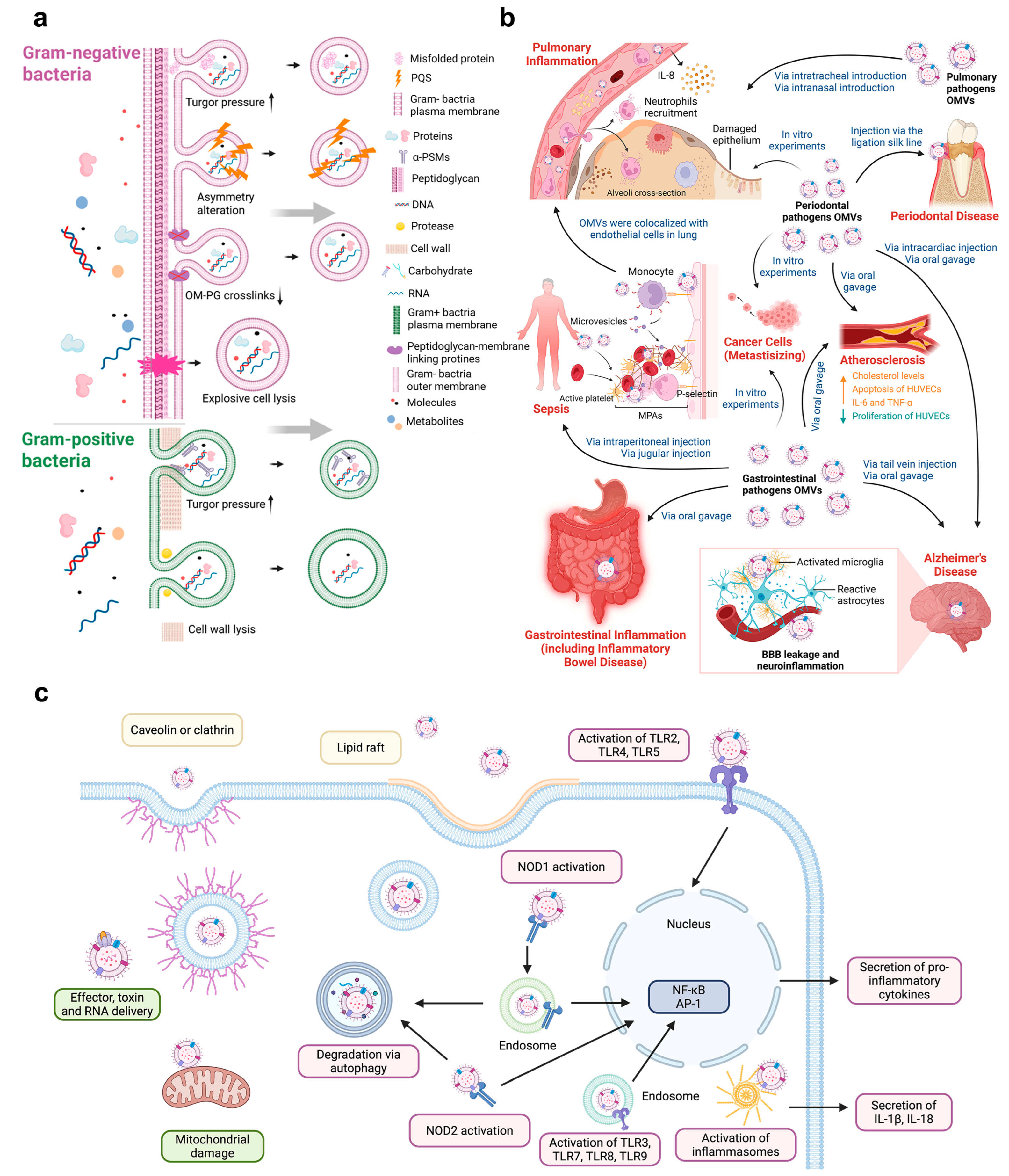 Figure 3. The lifecycle and pathogenic mechanisms of bacterial extracellular vesicles (BEVs). (a) Biogenesis and cargo packaging. There are three major types of vesicles produced by Gram-negative bacteria: the classic outer membrane vesicles (OMVs) produced by the bubbling of living cells, outer–inner membrane vesicles (OIMVs) and explosive outer membrane vesicles (EOMVs) produced by cell rupture triggered by endolysins, and OIMVs formed by the transient degradation of peptidoglycan (PG) by autolysins. The biogenesis mechanism of BEVs in Gram-positive bacteria remains unclear. OM: Outer membrane. Reproduced from Liang et al. [76], licensed under CC BY 4.0. (b) Delivery and associated diseases in human body. BEVs (primarily OMVs), particularly those from periodontal pathogens, can translocate via digestive tract or hematogenous routes (mimicked by oral gavage or injection in models) to distant organs. They are implicated in pulmonary inflammation, atherosclerosis, cancer metastasis, blood–brain barrier (BBB) leakage contributing to Alzheimer’s disease and gastrointestinal inflammation, highlighting the systemic impact of oral–gut crosstalk mediated by BEVs. Reproduced from Chen et al. [77], licensed under CC BY 4.0. (c) Host cell entry and pathogenic mechanisms. BEVs enter non-phagocytic host cells via various ways (e.g., lipid raft-associated uptake, clathrin- or caveolin-mediated endocytosis). Inside host cells, they deliver bacterial effectors and immunomodulatory sRNA, or induce mitochondrial damage, and can be detected by host innate immune receptors, triggering pro-inflammatory cytokine production. Finally, internalized BEVs are cleared via host autophagy. Created in BioRender. https://BioRender.com/v6muza7 (accessed on 11 December 2025).