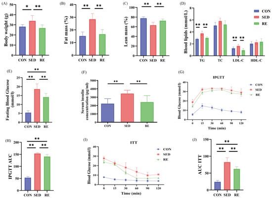 3.1. RE Improves Body Composition and Metabolic Indexes of T2DM Mice