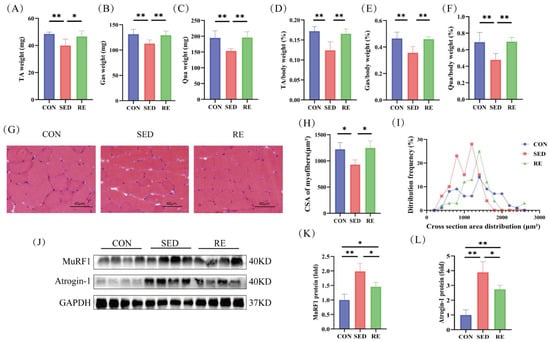 3.2. RE Counteracts Skeletal Muscle Atrophy in T2DM Mice