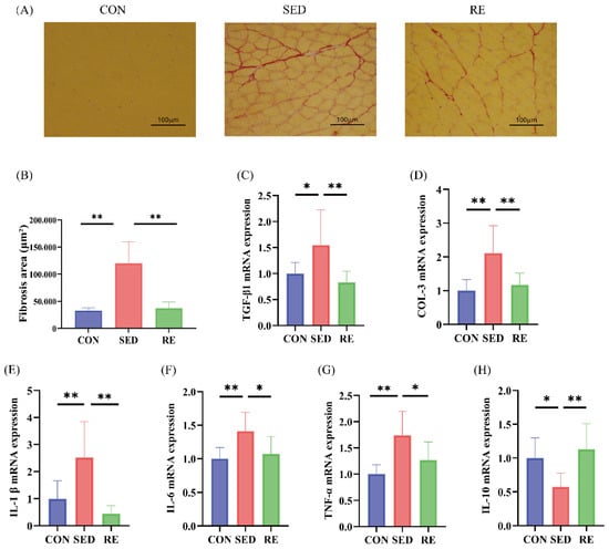 3.3. RE Alleviates Fibrosis and Inflammation of Skeletal Muscle in T2DM Mice