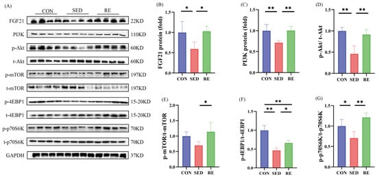 3.4. RE Activates FGF21/PI3K/Akt Signaling Pathway and Promotes Skeletal Muscle Protein Synthesis in T2DM Mice