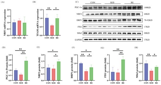 3.6. RE Improves Mitochondrial Biogenesis and Dynamics in Skeletal Muscle of T2DM Mice