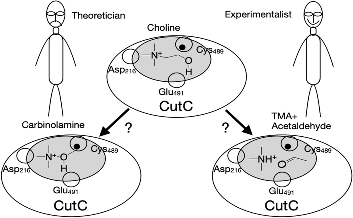 - Yang, Y.Q.; Deng, W.H.; Liao, R.Z. Mechanistic Insights into Choline Degradation Catalyzed by the Choline Trimethylamine-Lyase CutC. J. Phys. Chem. B 2025, 129, 5438–5448. [Google Scholar] [CrossRef]