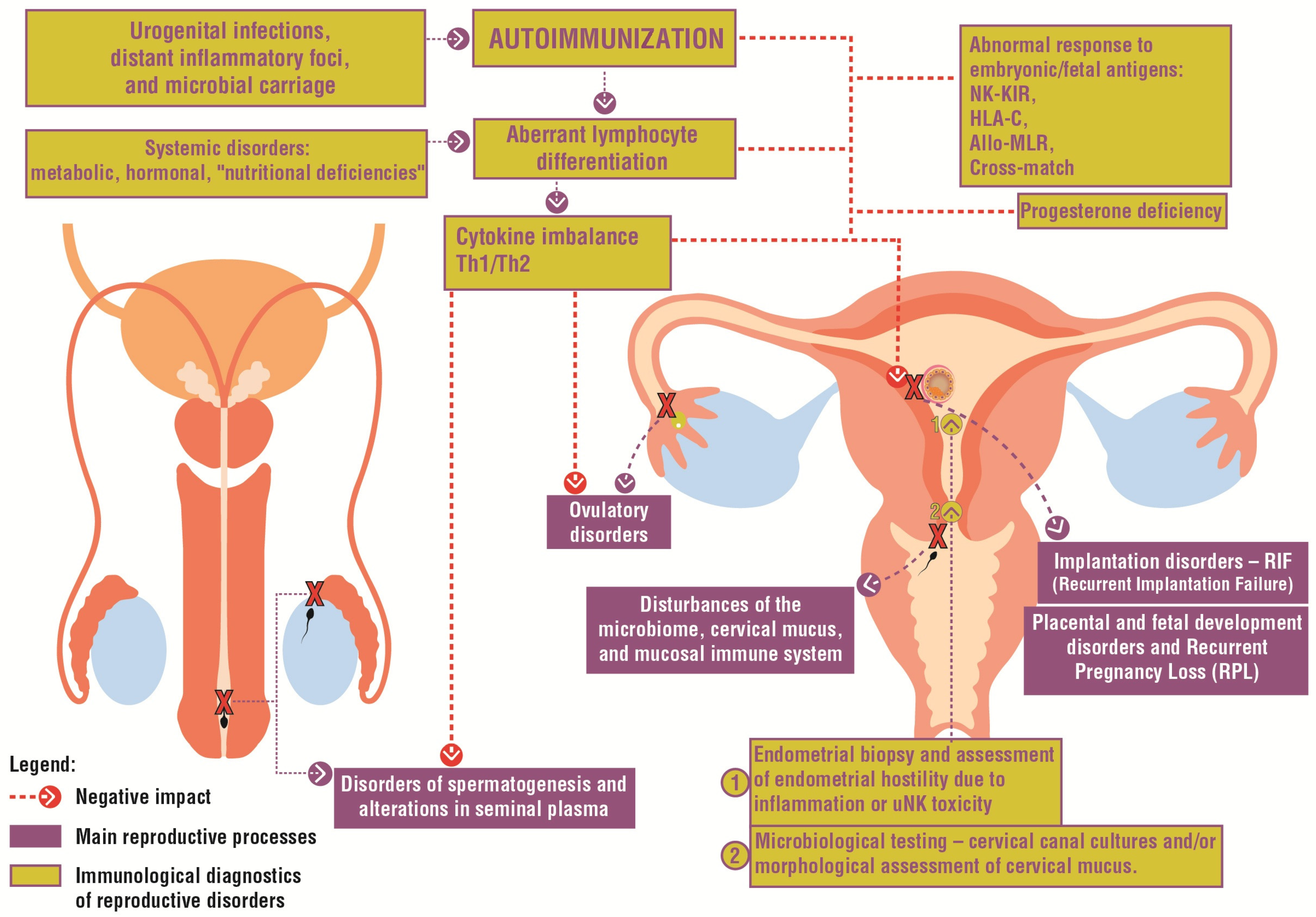 Diagnostic evaluation of immunological infertility should begin with the exclusion of systemic and local inflammatory processes within the reproductive tract, including chronic endometritis, autoimmune diseases, nutritional deficiencies, and disturbances in estrogen-progesterone homeostasis. Ongoing debate exists regarding the clinical value and positioning of tests assessing lymphocyte subpopulations and cytotoxicity, and maternal immune responses to paternal and embryonic antigens, owing to their methodological and interpretative limitations.