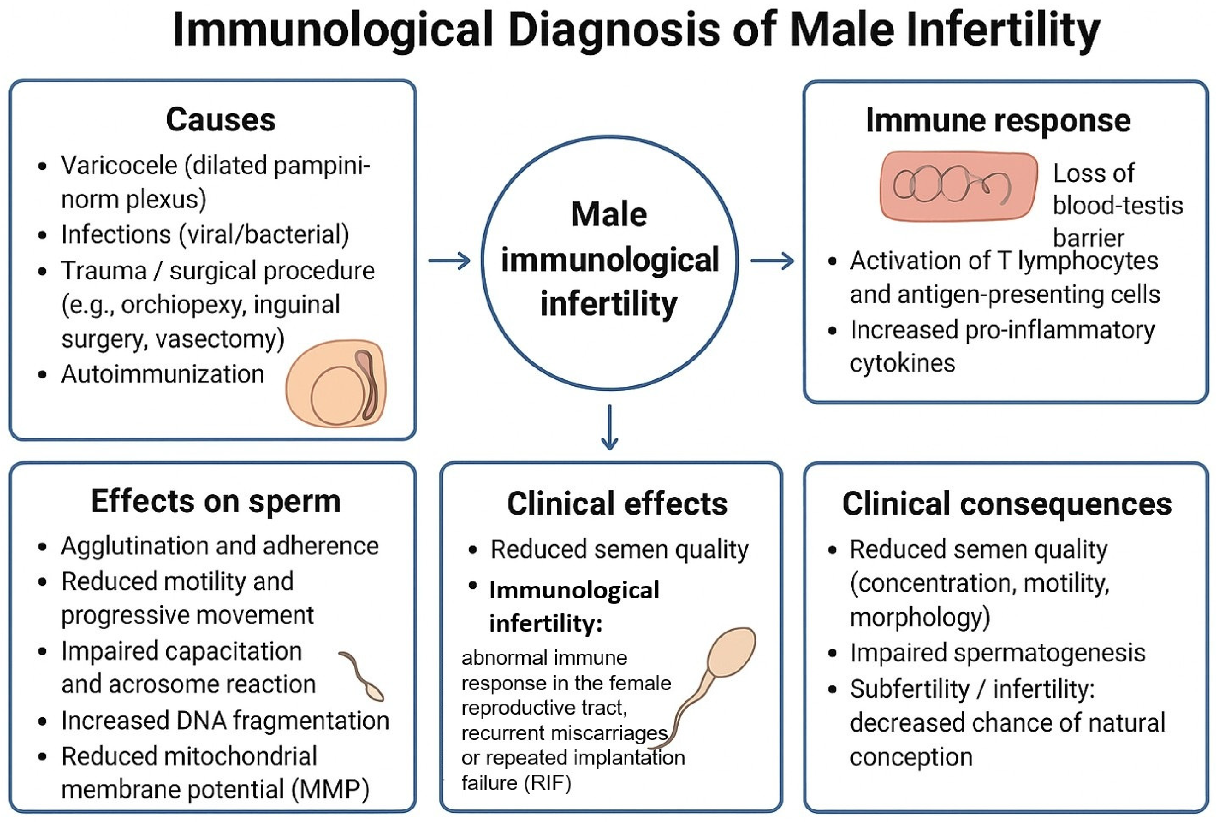 Male infertility of immunological origin may involve impaired spermatogenesis, defective sperm maturation, subsequent sperm damage, and abnormalities in seminal plasma composition. Sperm production takes place in the testes, which—being located outside the blood–testis barrier—constitute an immunologically privileged organ. Pathological conditions such as trauma, infections, varicocele, or other defects that disrupt the blood–testis barrier may trigger immune sensitization or promote infection, leading to reduced sperm quantity and quality in the ejaculate and the development of immunological infertility (