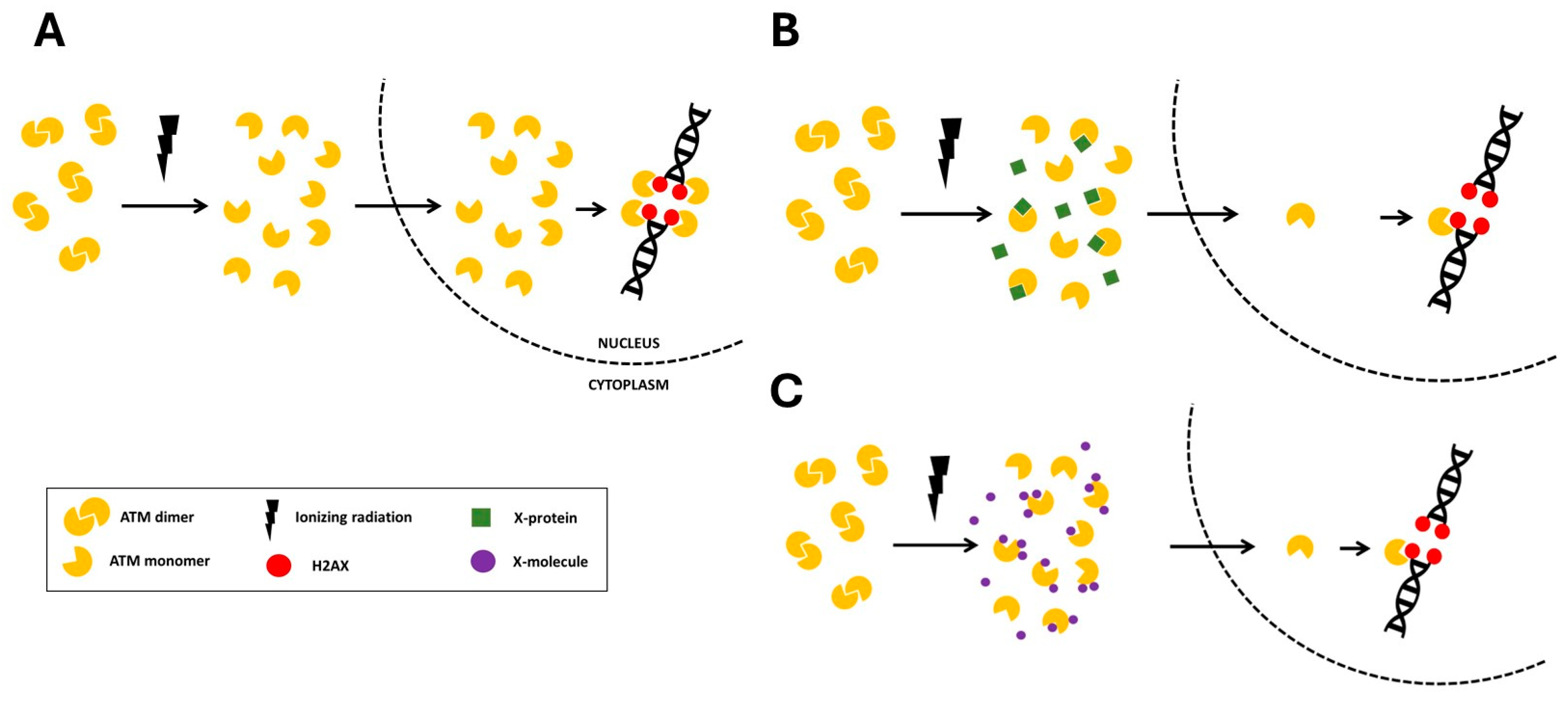 - Bodgi, L.; Foray, N. The nucleo-shuttling of the ATM protein as a basis for a novel theory of radiation response: Resolution of the linear-quadratic model. Int. J. Radiat. Biol. 2016, 92, 117–131. [Google Scholar] [CrossRef] [PubMed]