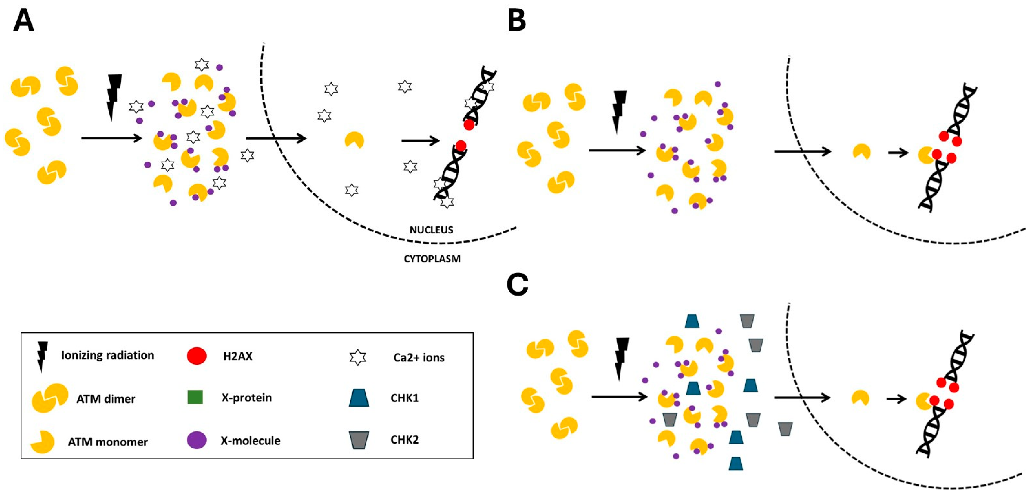 - Berthel, E.; Foray, N.; Ferlazzo, M.L. The Nucleoshuttling of the ATM Protein: A Unified Model to Describe the Individual Response to High- and Low-Dose of Radiation? Cancers 2019, 11, 905. [Google Scholar] [CrossRef]