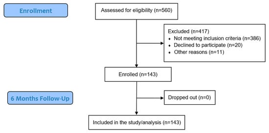 Of a total of 560 patients whose electronic health records were thoroughly reviewed, 174 met all inclusion criteria. Finally, a total of 143 participants agreed and were enrolled in the study (Figure 1).