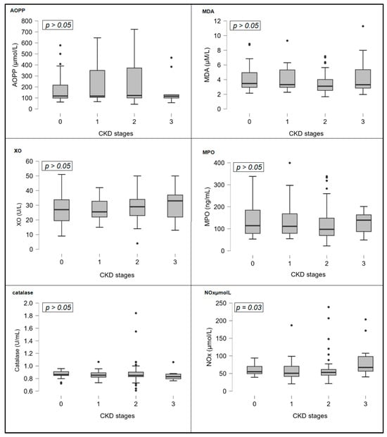In addition, various OS marker levels were compared along CKD stages. OS markers that represent deranged redox biology (AOPP, MDA, MPO, NOx, and XO) showed a gradual increase following CKD function decline. However, NOx values were found to significantly increase as CKD progressed. (Kruskal–Wallis test, p = 0.03). On the other hand, catalase, an antioxidant enzyme, decreased as CKD advanced, but this was not significant (p = 0.23). Figure 2 shows bar charts of OS markers across CKD stages.