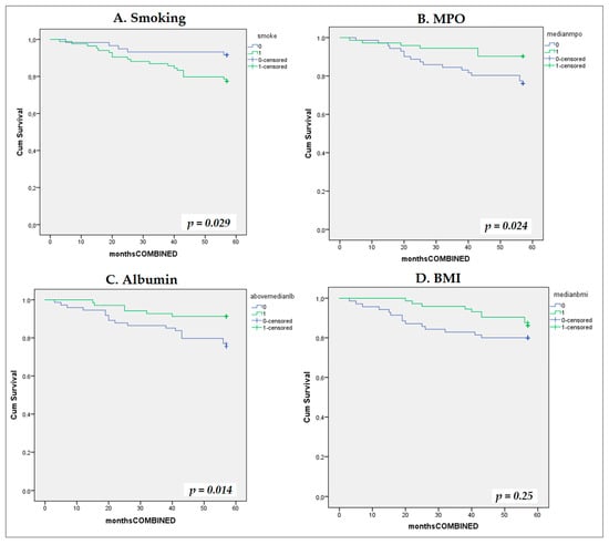 During the median follow-up of 52 months (3–57), we documented eight deaths in total (three deaths from CV causes) and 19 CV events (16 non-fatal). Hence, during the total number of 858 patient-months across 143 patients, 24 composite events occurred (incidence rate: 33.6 per 100 patient-years). Univariate Cox proportional hazard regression models showed that smoking (HR = 2.85, 95% CI 1.06–7.62, p = 0.037), MPO (HR = 0.99, 95% CI 0.98–0.99, p = 0.014) and albumin as a categorical variable above/below median value (HR = 3.0, 95% CI 1.19–7.60, p = 0.02) were associated with the composite outcome, whereas BMI lost its association with the outcome marginally (p = 0.07). We inserted MPO into the model as a categorical, dichotomous variable above/below the median value and found that it was associated with the composite outcome (HR = 2.7; 95% CI: 1.10–6.40; p = 0.030). Kaplan–Meier curves were performed for each variable: smoking, MPO, BMI, and albumin (Figure 3).