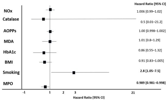 Cox proportional hazards regression analysis using forward stepwise selection for composite cardiovascular endpoint. Model development and variable selection: Forward stepwise selection was employed to identify independent predictors of the composite cardiovascular endpoint. Abbreviations: AOPPs, advanced oxidation protein products; BMI, body mass index; CI, confidence interval; HbA1c, hemoglobin A1c; MDA, malondialdehyde; MPO, myeloperoxidase; NOx, nitrite oxide species.