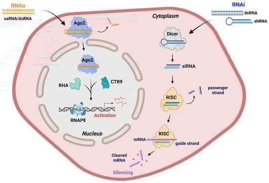 At the molecular level, RNAa shares some mechanistic components with RNAi but differs markedly in both outcome and subcellular localization (Figure 1). While RNAi primarily occurs in the cytoplasm to silence mRNAs, it can also contribute to heterochromatin formation in the nucleus under specific contexts [44,45,46]. In contrast, RNAa is initiated in the nucleus, where saRNAs or endogenous noncoding RNAs (ncRNAs) form a complex with Ago proteins, particularly Ago2 [8,9,47,48]. Recent studies suggest that Ago1 may also participate in promoter–proximal RNAa events in the nucleus, potentially complementing the Ago2-dependent pathway. This raises the possibility of functional specialization among different Ago family members in promoter-associated RNA regulation [49,50].