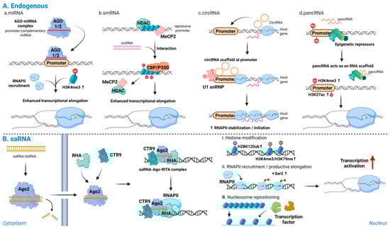 In addition to miRNA- and saRNA-guided RNAa, several classes of promoter-associated ncRNAs, including smRNAs, circRNAs, and pancRNAs, have also been reported to induce RNAa-like transcriptional activation, in part through interactions with chromatin-associated regulators.