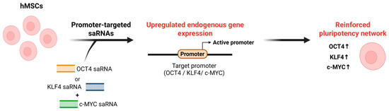 Figure 3. Schematic of RNAa-based activation of pluripotency regulators. In hMSCs, promoter-targeted saRNAs designed against the OCT4, KLF4, or c-MYC promoter are delivered into cells and recognize complementary sequences at the target promoter. This RNAa induces promoter activation and upregulation of endogenous OCT4, KLF4, and c-MYC expression, thereby reinforcing pluripotency-associated transcriptional networks in hMSCs. Note: Abbreviations: hMSC, Human mesenchymal stem cell. Created in Biorender. Lee, H. (2025) https://app.biorender.com/illustrations/68afd2ff58b546446ba9a294?slideId=d644e283-3965-4d0f-98bf-b27d89625255.