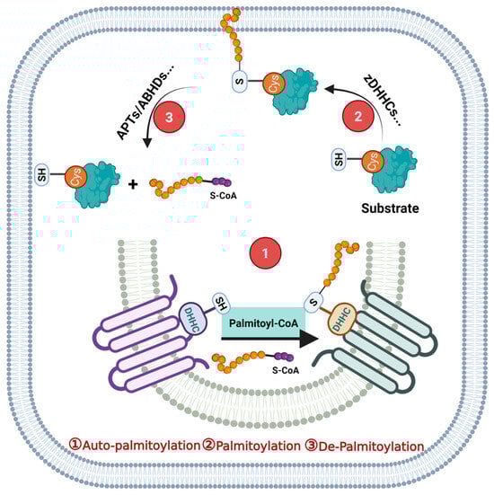 The dynamic regulation of protein S-palmitoylation. ① Palmitoyl acyltransferases perform autopalmitoylation within their DHHC domain in the endoplasmic reticulum or Golgi lumen/plasma membrane. ② The autopalmitoylated palmitoyl acyltransferases transfer palmitate to the substrate cysteines to accomplish palmitoylation. ③ Thioesterases (APTs or ABHDs) remove the palmitate from the palmitoylated proteins, and this process is named depalmitoylation. DHHC: Asp-His-His-Cys, SH: Cys, APT: acyl-protein thioesterases, ABHD: α/β-hydrolase domain, S-palmitoy-coenzyme A (S-CoA). This figure was created in Biorender Feng, Y.H. (2025) https://app.biorender.com/ (accessed on 16 September 2025).